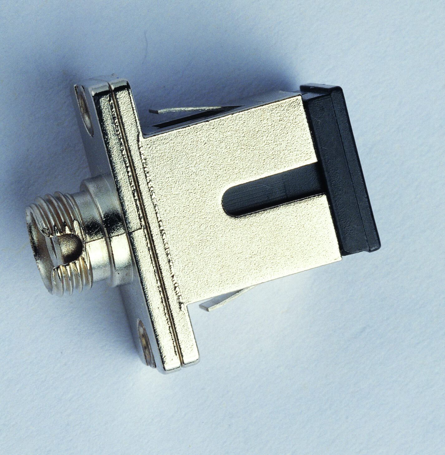 光纤适配器是一种采用弹性套筒或刚性内孔来实现精密光纤对中的装置,采用矩形结构及弹性卡子锁紧机构实现将同一类型的不同连接器插头连接对中,以保证两个光纤活动连接器的连接性能。